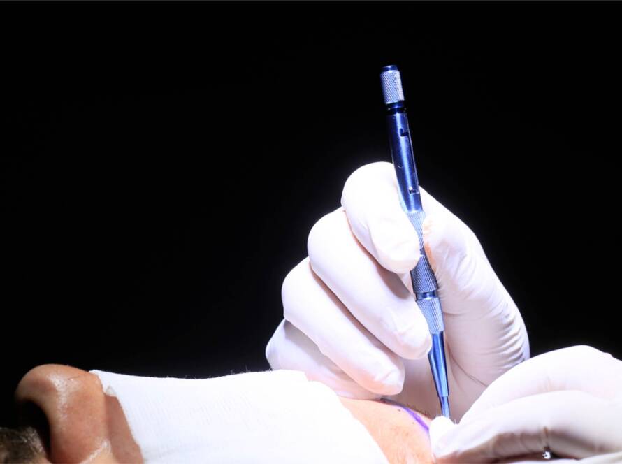 The doctor opens channels in the areas of baldness that are due to be treated with Choi Pen Implanters.